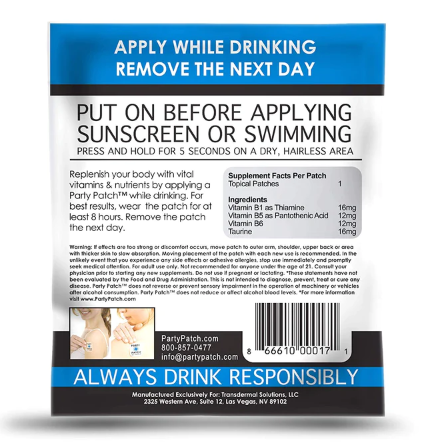 ¡PARTY PATCH REDUCE DRÁSTICAMENTE LOS EFECTOS SECUNDARIOS FÍSICOS DEL CONSUMO DE ALCOHOL Y HACE QUE LAS MAÑANAS SEAN INCREÍBLES!